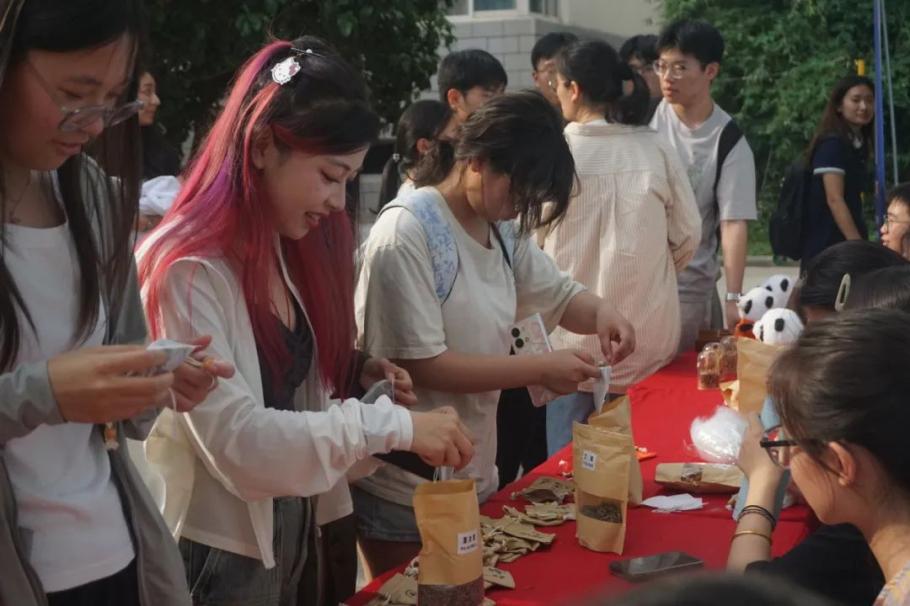 香囊制作区前排起长队,现场准备了十余种道地中药材,包括艾叶、薰衣草、薄荷等,参与者可根据个人需求自由搭配药材,定制具有驱蚊、安神、醒脑等不同功效的香囊。大家学习传统香囊的制作工艺,从填充药材到缝合封口,每一步都细致入微。这不仅是一场手工制作的实践体验,更是一次对非遗文化的深度触摸与传承。