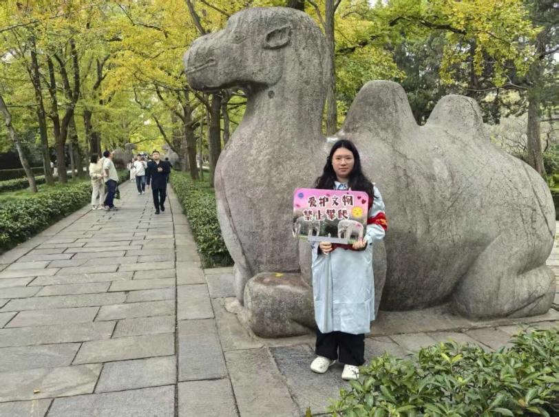 从明孝陵1号门领取装备开始,志愿者们便分赴石狮、獬豸、麒麟、石马等点位,手持“爱护文物 禁止攀爬”的宣传牌,在游人如织的神道上来回巡查。照片中,他们或在石狮旁微笑劝阻游客,或在骆驼石像前耐心引导,红马甲的鲜亮色彩与六百年文物的古朴质感形成强烈共鸣,既守护着历史的厚重,又传递着青春的热忱。