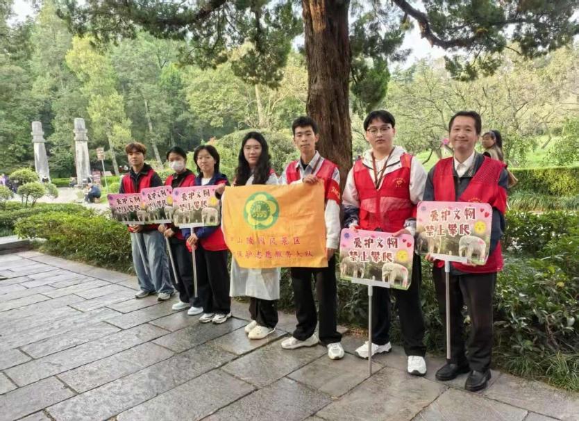 志愿者们不仅是文明旅游的引导者,更化身文化故事的讲述者。他们提前研习石象路神兽的寓意、明孝陵的历史背景,将专业的讲解融入志愿服务中。正如我们都以同样的敬畏之心,守护着明孝陵的一砖一瓦、一草一木。